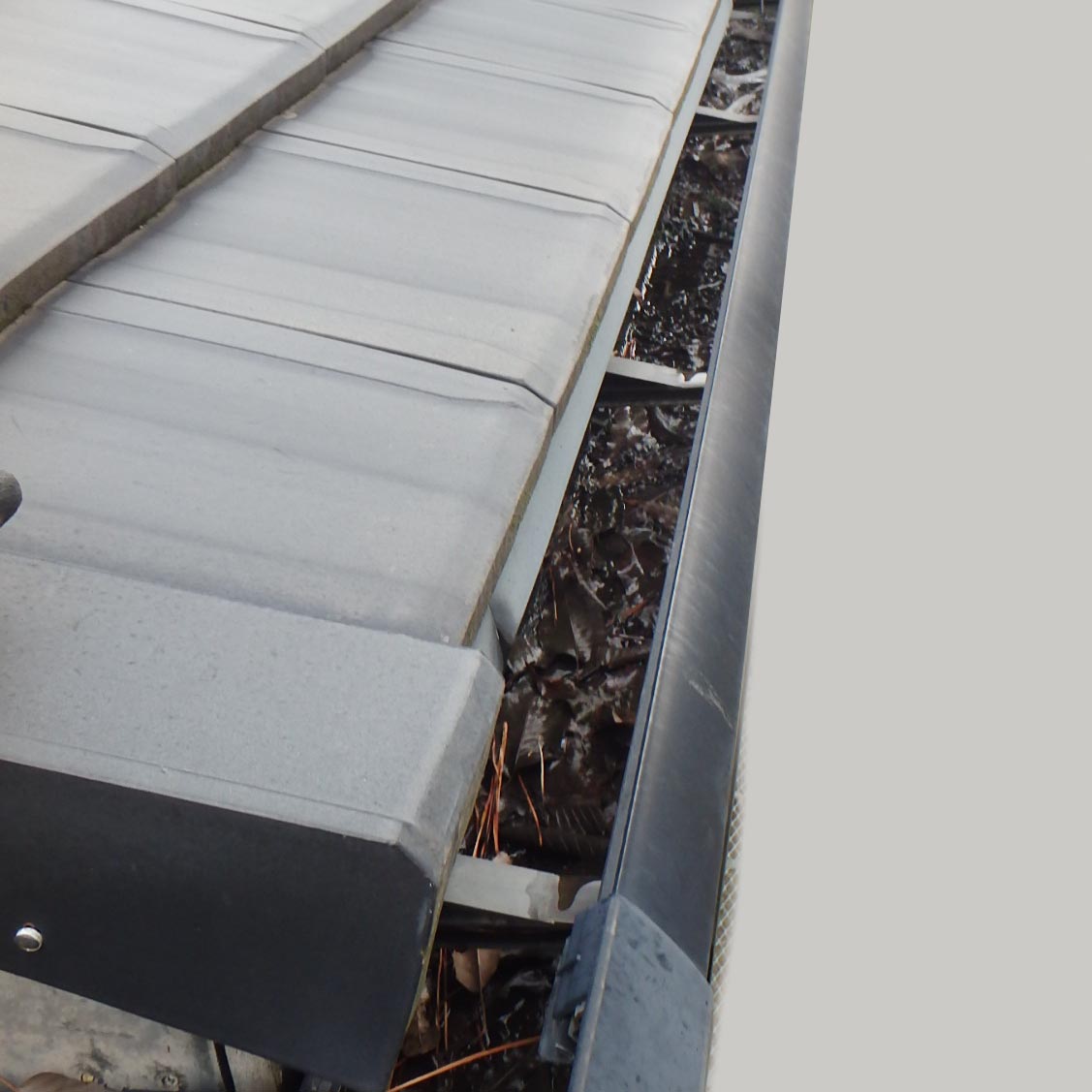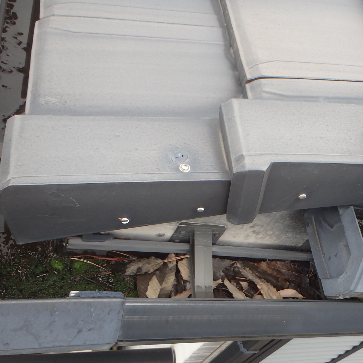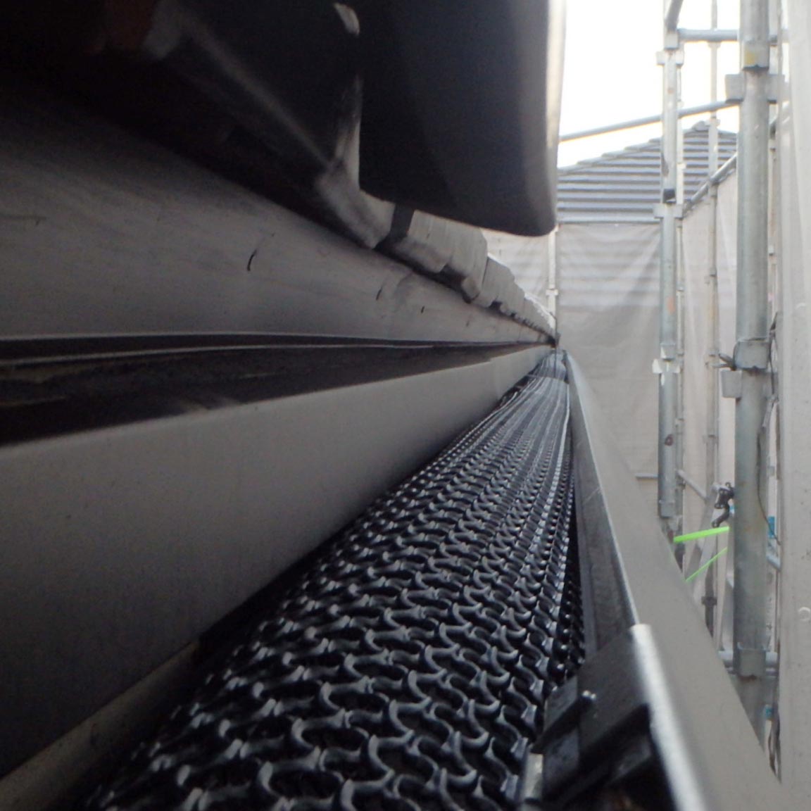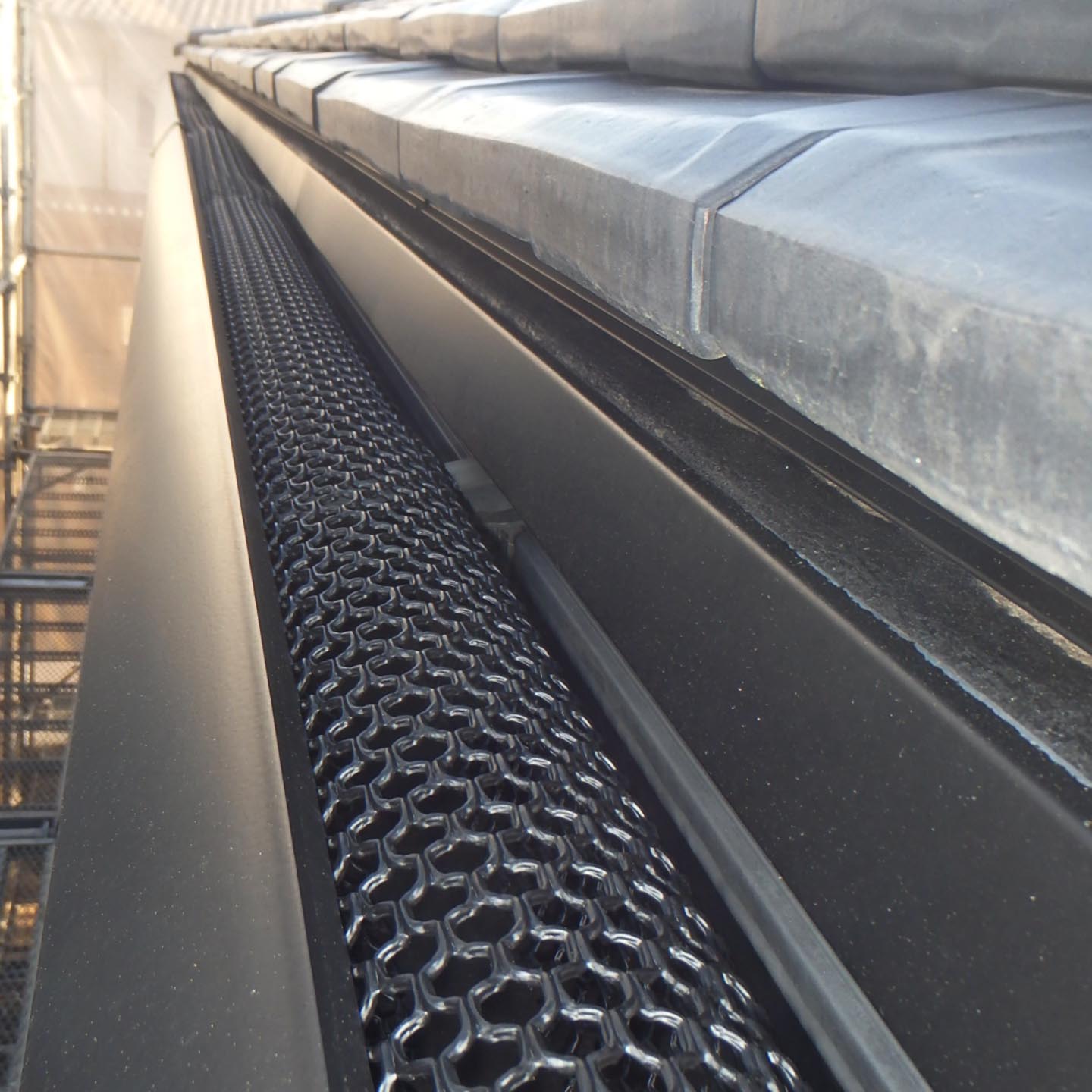 写真のように雨どいにカバーを取り付けると、落ち葉や小枝などが雨どい内部に入りにくくなります。これにより、詰まりによるあふれや水漏れのリスクを減らし、定期的な清掃の手間も軽減できます。